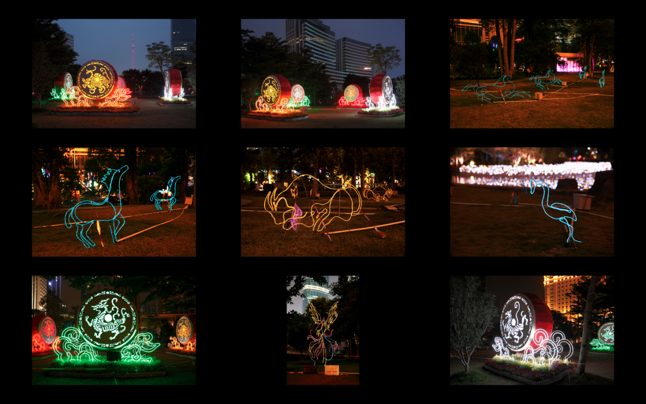 The design concept of the festival is "A thousand flowers bloom at night, and the lights go out", with a unified theme linking all venues. Under the guidance of this design concept, Illus perfectly integrates traditional Chinese imagery, Guangzhou elements and modern means, such as the four mythical beasts, ancient lanterns, and Lingnan's unique kapok and banyan trees, etc., and combines shadow puppets, hand shadows, lantern riddles and other popular forms of viewing and amusement, as well as popular sand paintings, animation images and other means to create a unique and unique light festival. Combined with the popular forms of viewing and amusement such as shadow puppets, hand puppets, lantern riddles and other popular means such as sand paintings and animation images, the festival creates a unique light festival with cultural connotations.