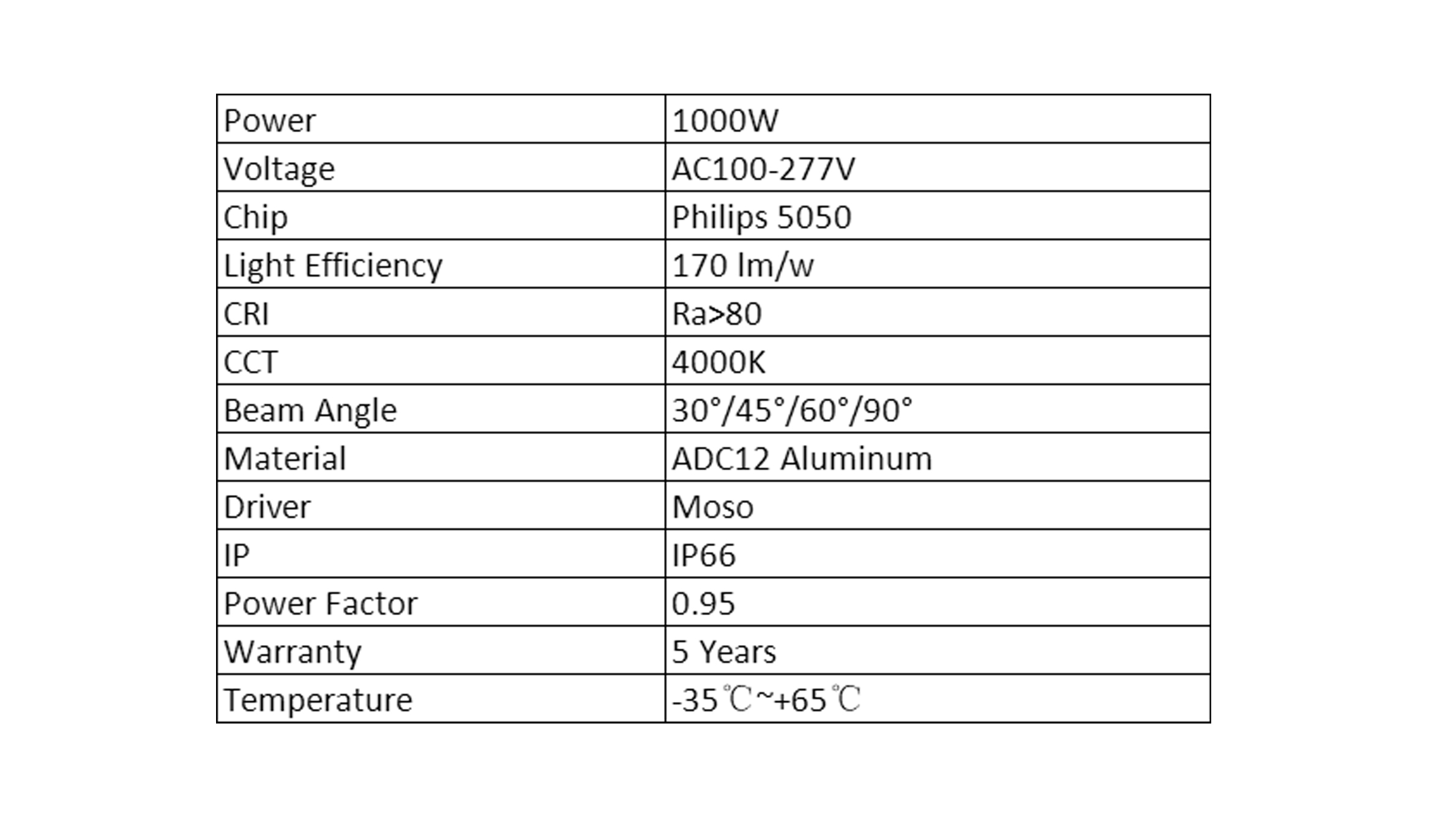 Con chips LED Philips 5050, este proyector entrega unos impresionantes 170.000 lúmenes con una eficiencia lumínica de 170 lm/w, asegurando una iluminación brillante y uniforme con un CRI superior a 80 para una reproducción precisa de los colores. Ofrece cuatro opciones de ángulo de haz: 30°, 45°, 60° y 90°, proporcionando soluciones de iluminación flexibles para adaptarse a las necesidades de diferentes espacios, lo que lo convierte en una opción ideal para campos deportivos y otras áreas grandes que requieren iluminación precisa.